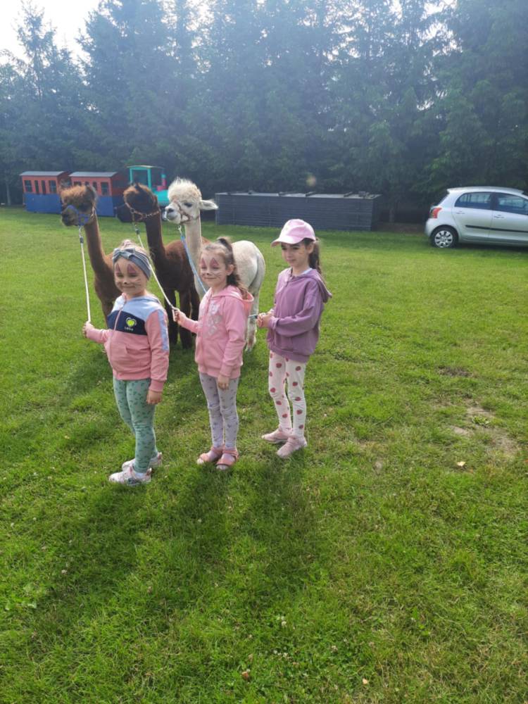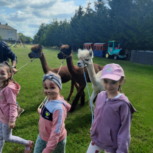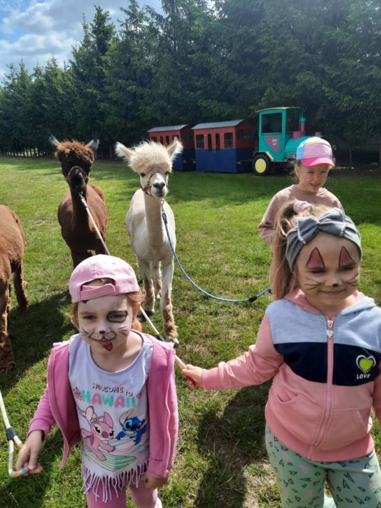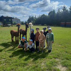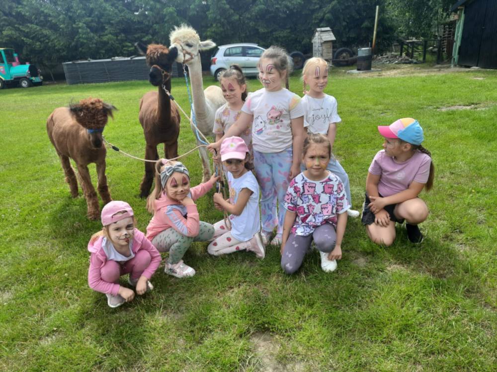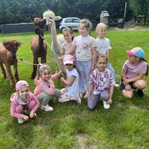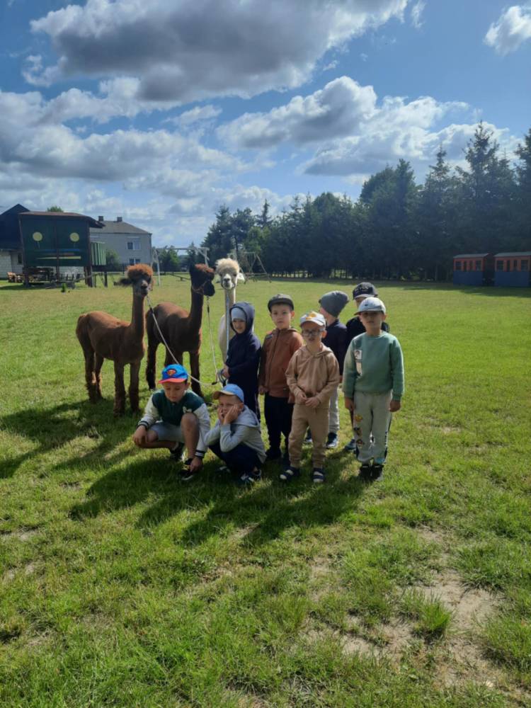24.06.2025r. przedszkolaki z grupy IV Misie pojechały na wycieczkę so Alpakowej Ostoi w Maniach. Dzieci w bezpośrednim kontakcie z przyrodą wiele dowiedziały się o życiu, pochodzeniu, zwyczajach i sposobie odżywiania alpaki. Miały mozliwość pospacerowania z alpakami: Biszkoptem, Paco i Julianem w grupach i indywidualnie pod bystrym okiem p. Gosi i wychowawczyni p. Iwony. Zabawy na placu i przejażdżka elektryczną ciuchcią dały wiele radosci, a pieczone na ognisku kiełbaski wiele smaku. Quizyi warsztaty w stodole pozwoliły dotknąć i poznać do czego wykorzystywana jest alpakowa wełna i wykonać z niej pracę plastyczną.