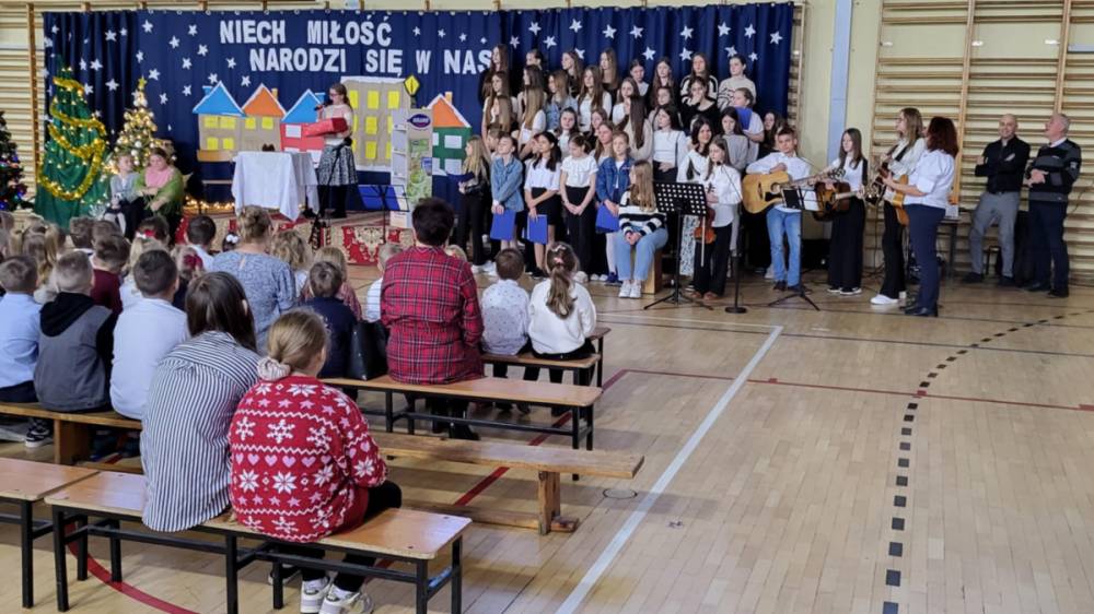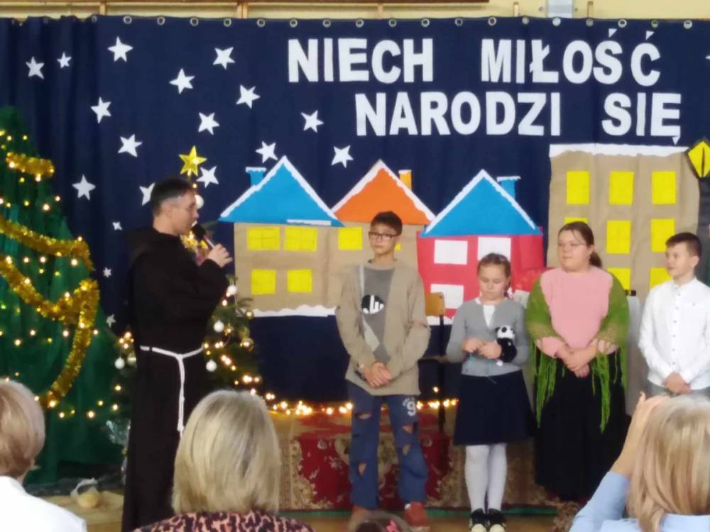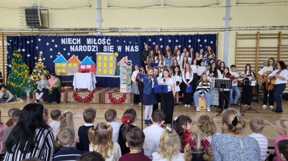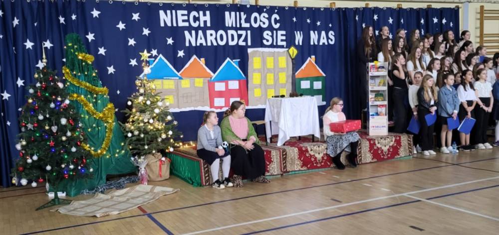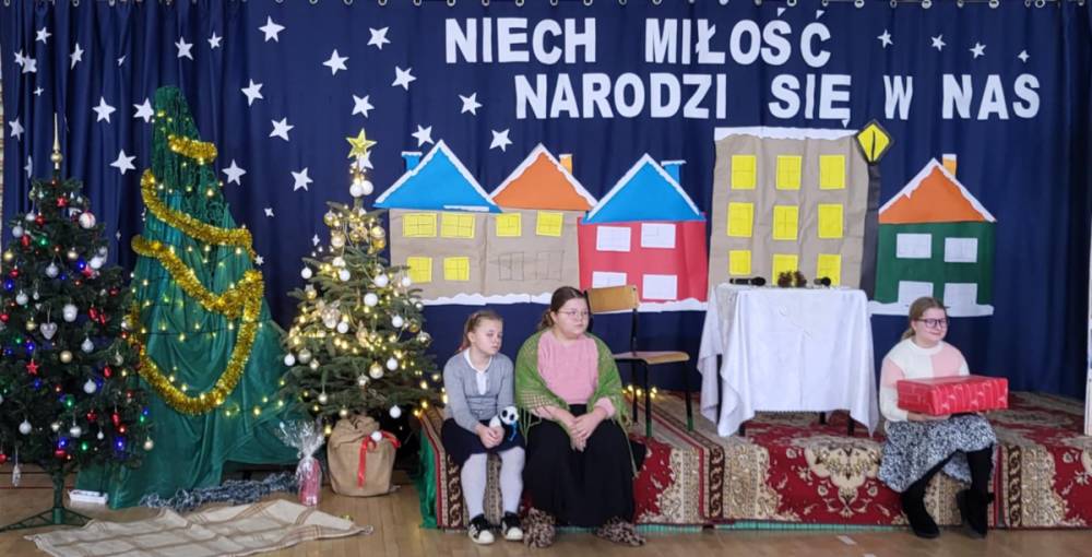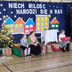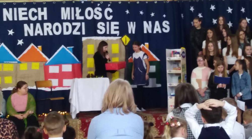 Dnia 20.12.2024 r. odbył się apel świąteczny . Pani Dyrektor Iwona Chmielewska powitała przybyłych gości w osobie Ks. wikariusza Krzysztofa Sobczuka , rekolekcjonisty franciszkanina o. Juliusza i Przewodniczącego Rady Gminy pana Piotra Łątkę. Nasi uczniowie zaprezentowali przedstawienie bożonarodzeniowe pt. ,,Niezwykły prezent" . Babcia grająca swoją rolę miała znależć sposób na odzyskanie radości wśród ludzi smutnych , zdenerwowanych. Tym sposobem okazał się ,,niezwykły prezent'' , który przemieniał na lepsze serca wszystkich mieszkańców. Przekazywany z rąk do rąk upominek ,do którego włożono ,,trochę miłości" miał magiczna moc . Wnosił do ich życia dużo radości ,ciepła i życzliwości . Przedstawienie zostało ubogacone pięknymi kolędami i pastorałkami w wykonaniu chóru szkolnego i solowym naszych uczennic . Wprowadziło wszystkich w świąteczny nastrój i dostarczyło wielu wzruszeń. Całość przygotowały panie : Edyta Pająk i Bożena Wawryniuk.