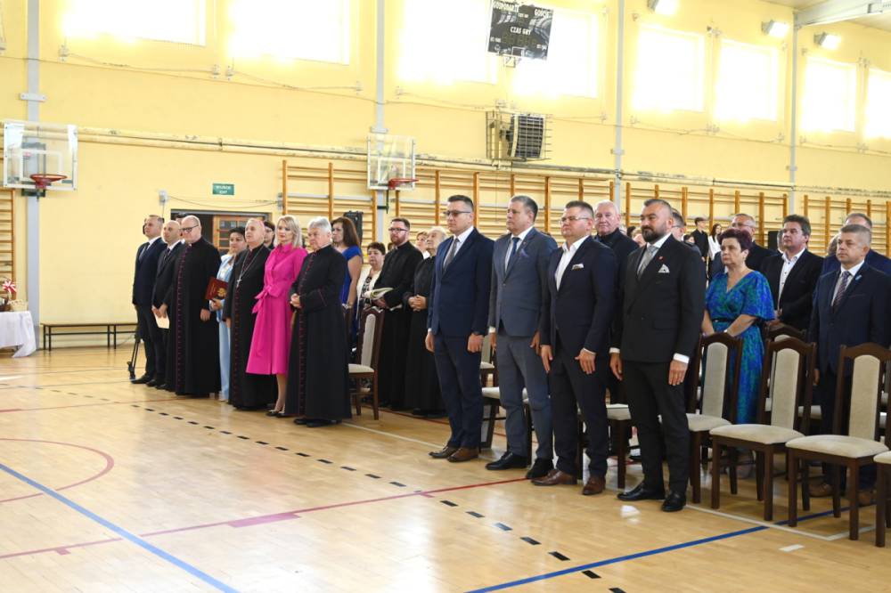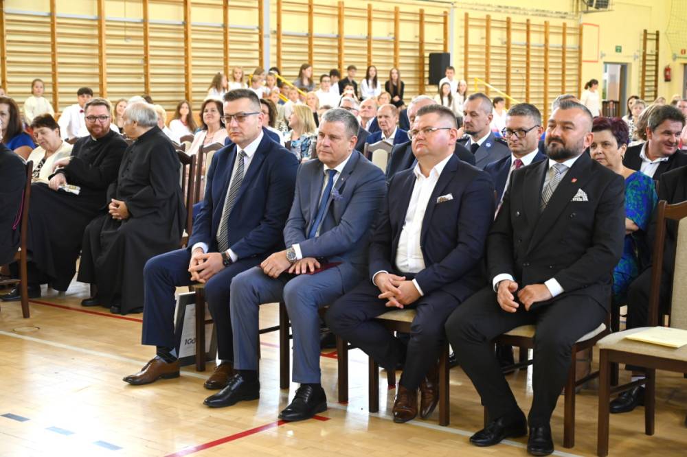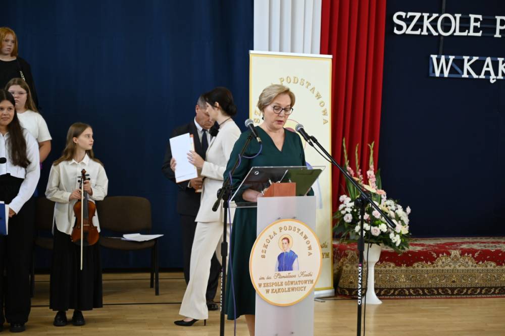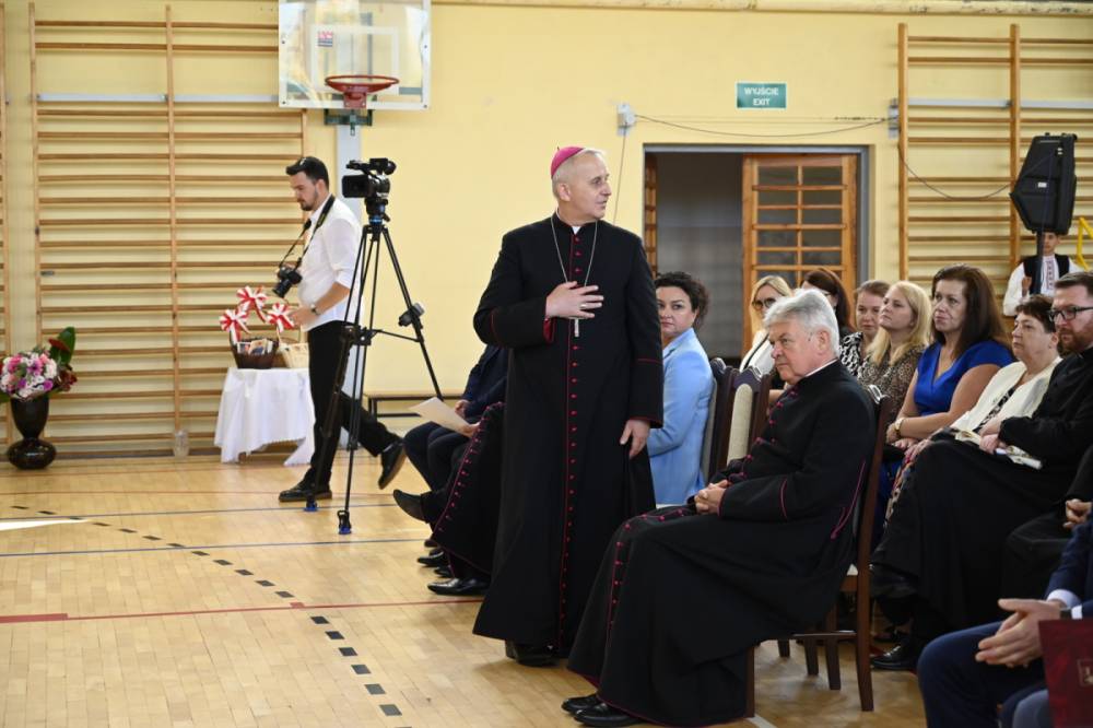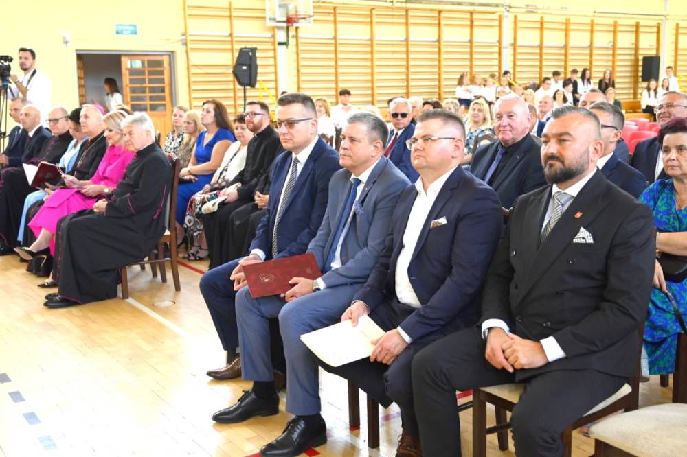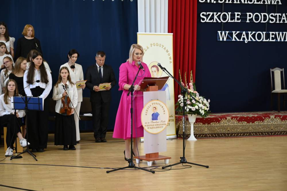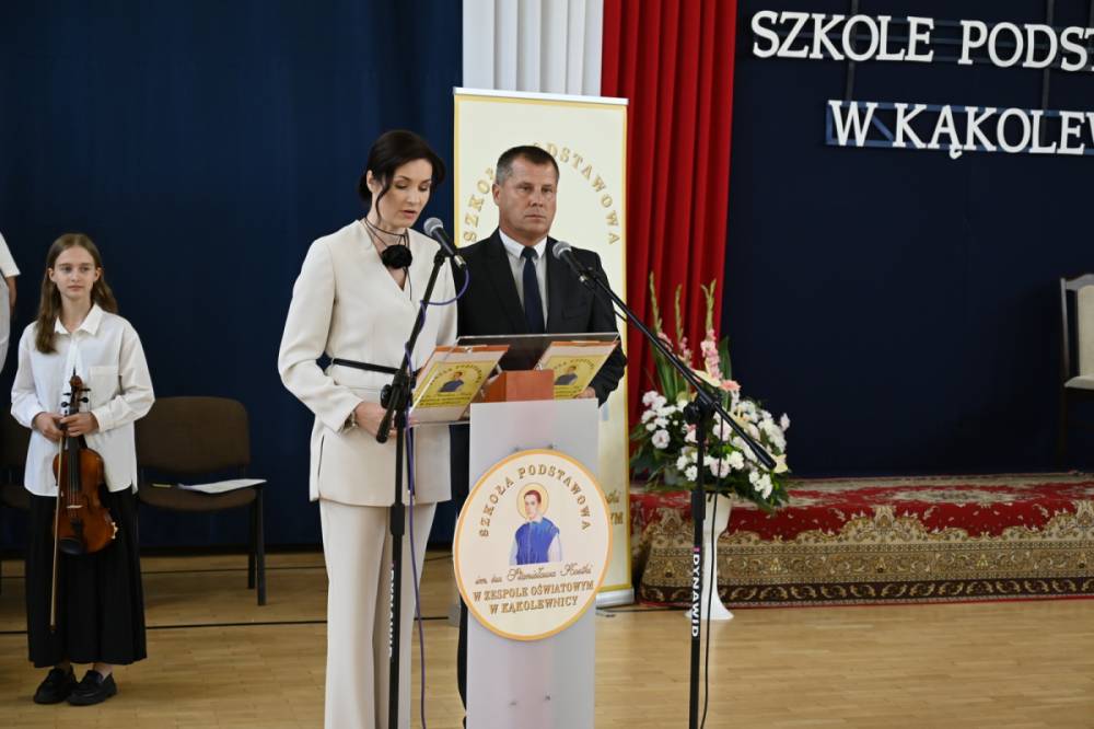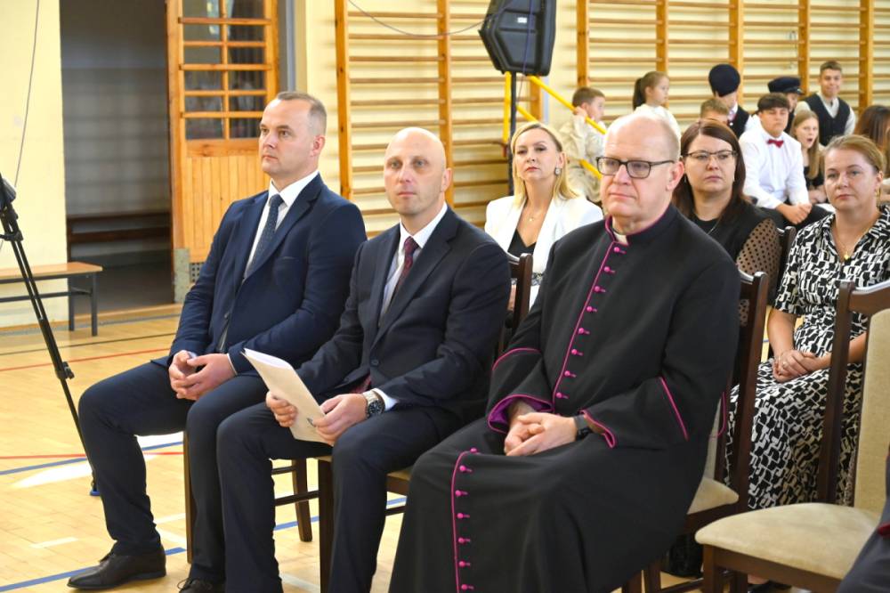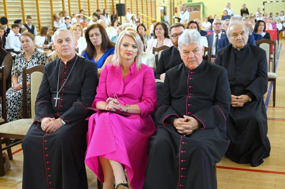 Pani Dyrektor Iwona Chmielewska przywitała szanownych gości, którzy zaszczycili nas swoją obecnością w tym szczególnym dniu: JE Biskupa Grzegorza Suchodolskiego, Dziekana Dekanatu Międzyrzeckiego Ks.Kan. Dariusza Parafiniuka, Proboszcza Parafii Kakolewnica Ks.Kan. Janusza Sałaja, Ks. Seniora Emiliana Zarzyckiego, Wikariusza Ks. Krzysztofa Sobczuka, Pana Jarosława Kwaska Członka Zarządu Województwa Lubelskiego, Pana Piotra Mackiewicza Wicekuratora Kuratorium Oświaty w Lublinie, Pana Szczepana Niebrzegowskiego Starostę Radzyńskiego, Pana Grzegorza Gałeckiego Przewodniczącego Rady Powiatu Radzyńskiego wraz z radnymi, Aspiranta sztabowego Pana Janusza Mazurka Naczelnika Wydziału Prewencji Komendy Powiatowej Policji w Radzyniu Podlaskim, Panią Mariolę Król Dyrektora Poradni Psych. Ped. w Radzyniu Podlaskim, Pana Piotra Łątkę Przewodniczącego Rady Gminy Kąkolewnica wraz z radnymi, Panią Annę Mróz Wójta Gminy Kąkolewnica wraz z pracownikami Urzędu Gminy, Pana Daniela Grochowskiego Wójta Gminy Radzyń Podlaski, Pana Stanisława Okońskiego wieloletniego Dyrektora szkoły, Panią Zofię Goławską byłą Dyrektor Gimnazjum i wszystkich zgromadzonych.