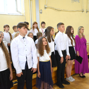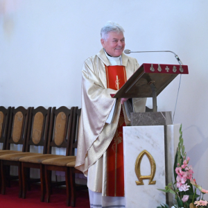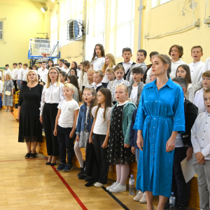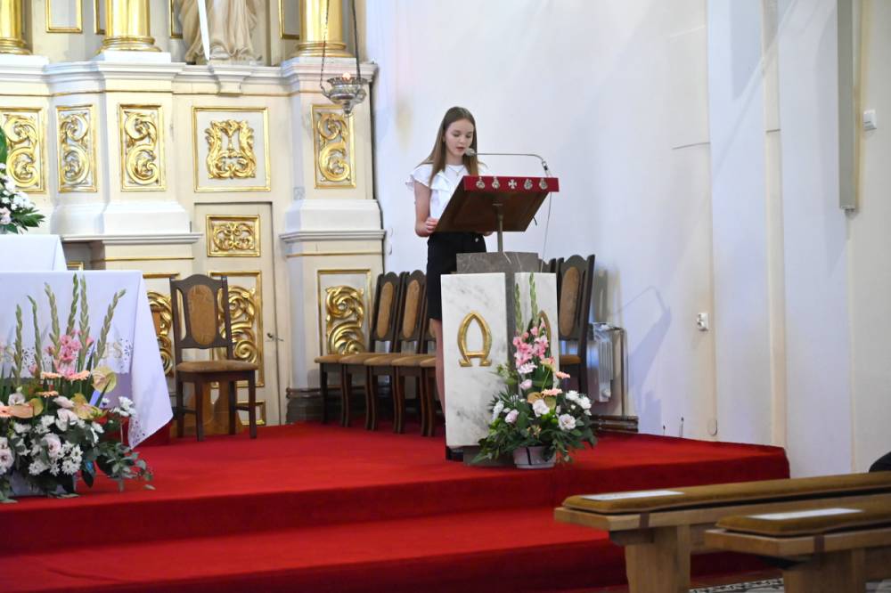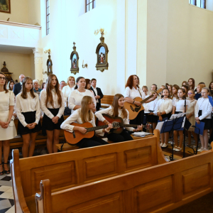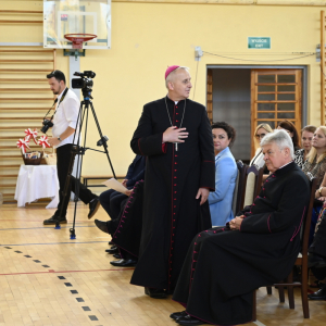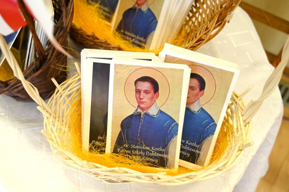 Następnie wszyscy zebrani obejrzeli część artystyczną przygotowaną przez uczniów szkoły pod kierunkiem pani Alicji Zieńczuk i pani Anny Głowniak, którą wzbogacał szkolny chór pod kierunkiem Pani Bożeny Wawryniuk. Wyjątkowy program artystyczny, który przeniósł nas w historię z życia św. Stanisława Kostki i jego drogę do wiary wzruszył zgromadzonych i otrzymał uznanie od Biskupa Grzegorza Suchodolskiego, który zabierając głos wyraził zadowolenie i podziw dla młodych artystów.
