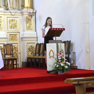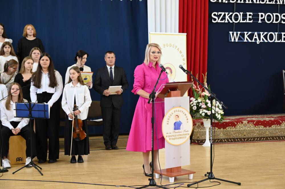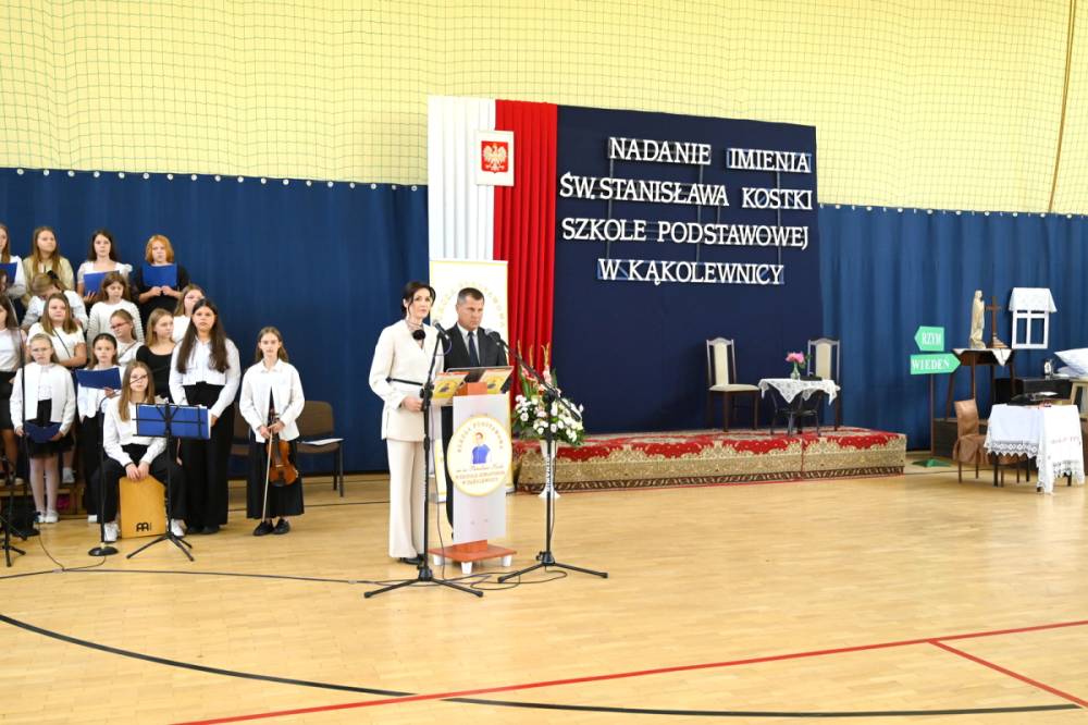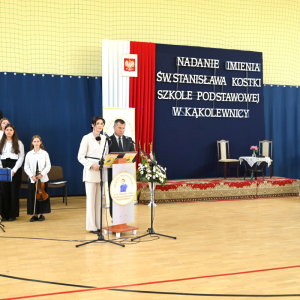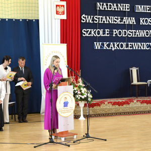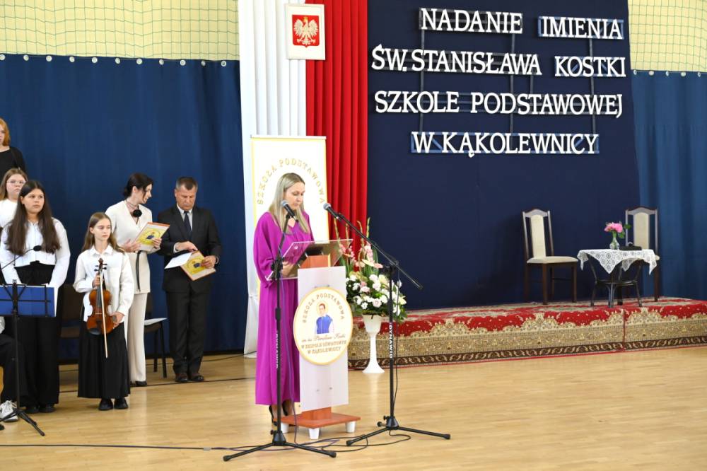 Historię naszej szkoły oraz uzasadnienie wyboru św. Stanisława Kostki na patrona przedstawiła Pani Aneta Zarzycka, po czym Wójt Gminy Kąkolewnica Pani Anna Mróz odczytała Uchwałę Rady Gminy o nadaniu Szkole Podstawowej w Kąkolewnicy Imienia św. Stanisława Kostki.