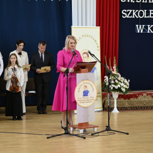 Po tym akcie głos zabrala Pani Dyrektor, która w swoim przemówieniu podkreśliła konieczność nie tylko przyjęcia imienia patrona ale naśladowania go w codziennym życiu i kierowania się Jego wartościami.